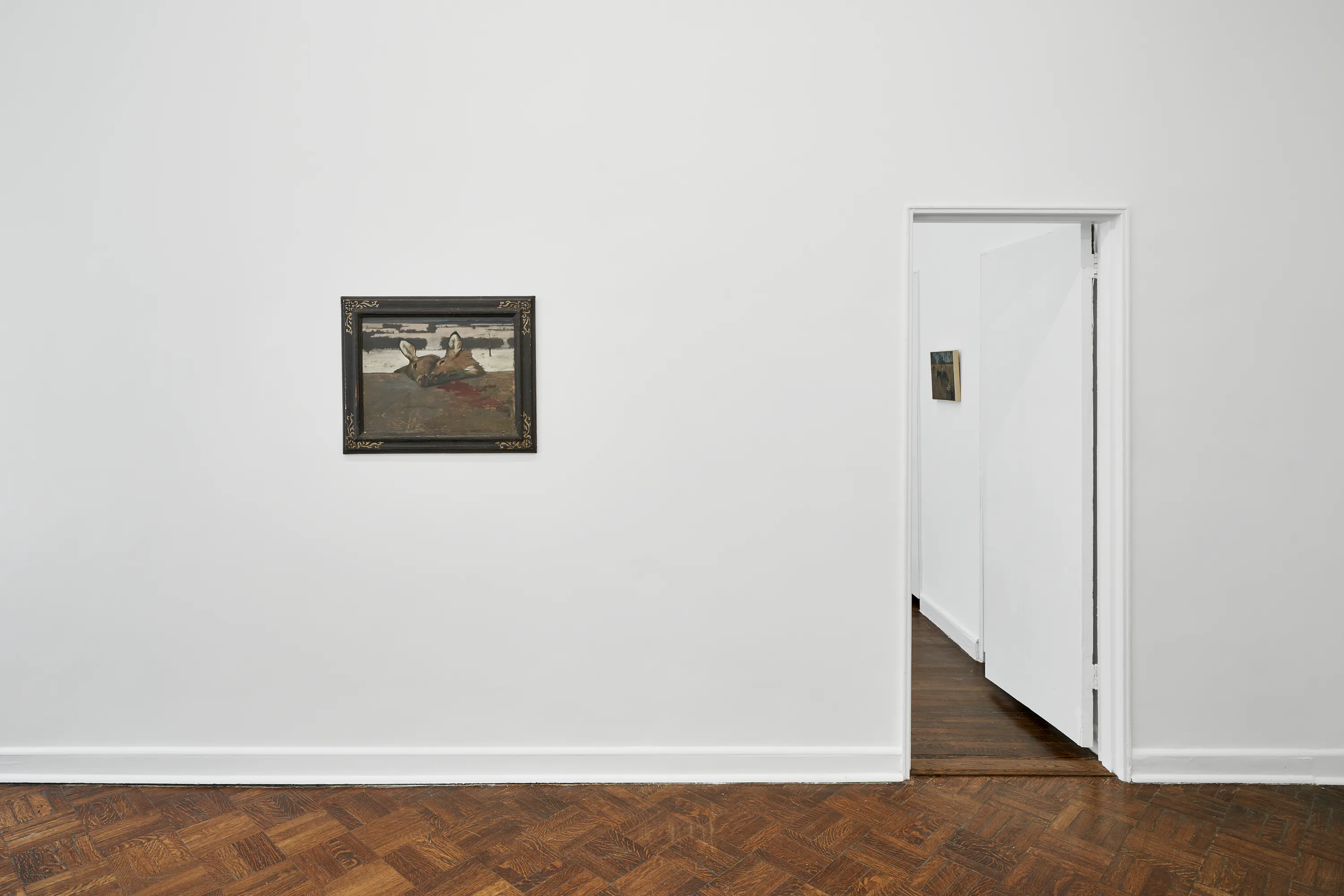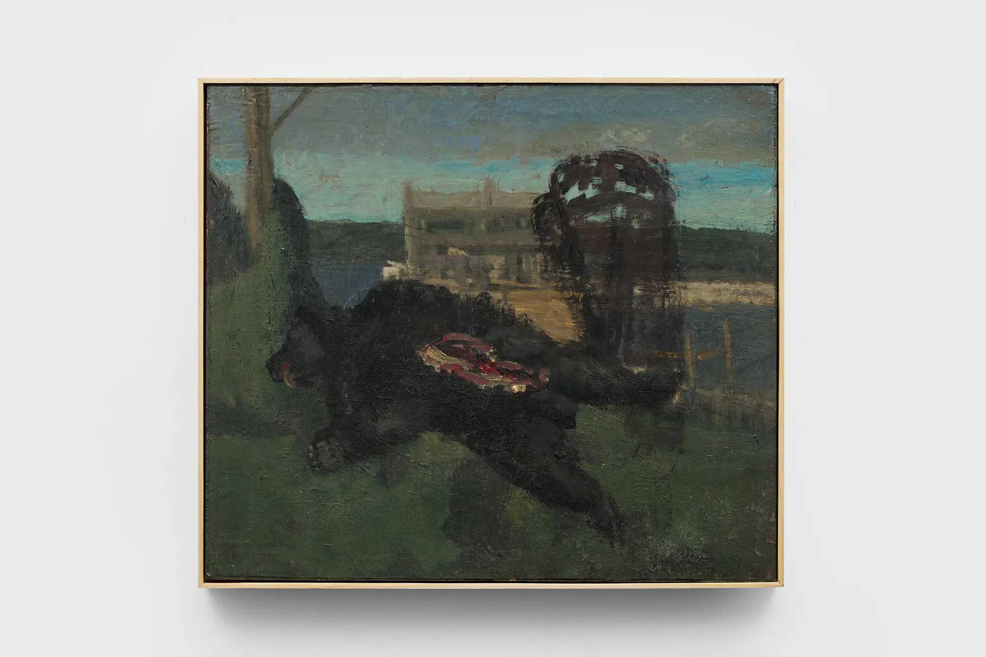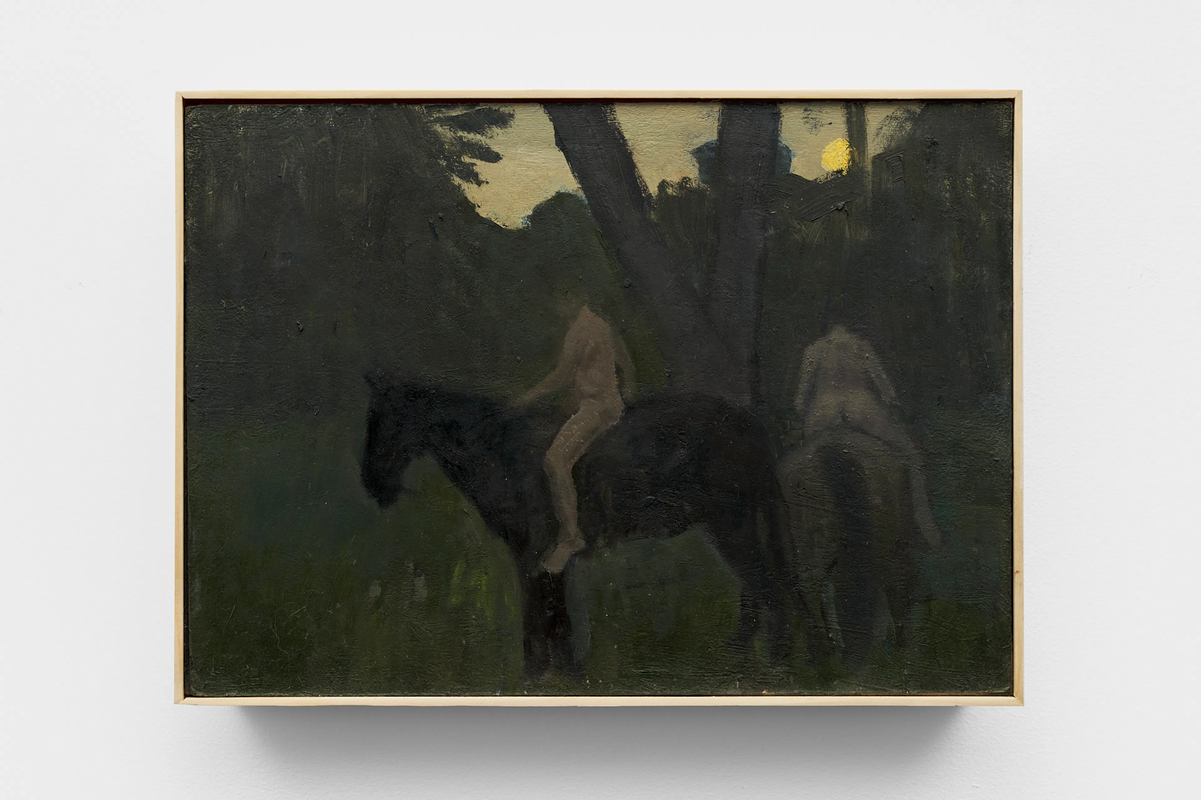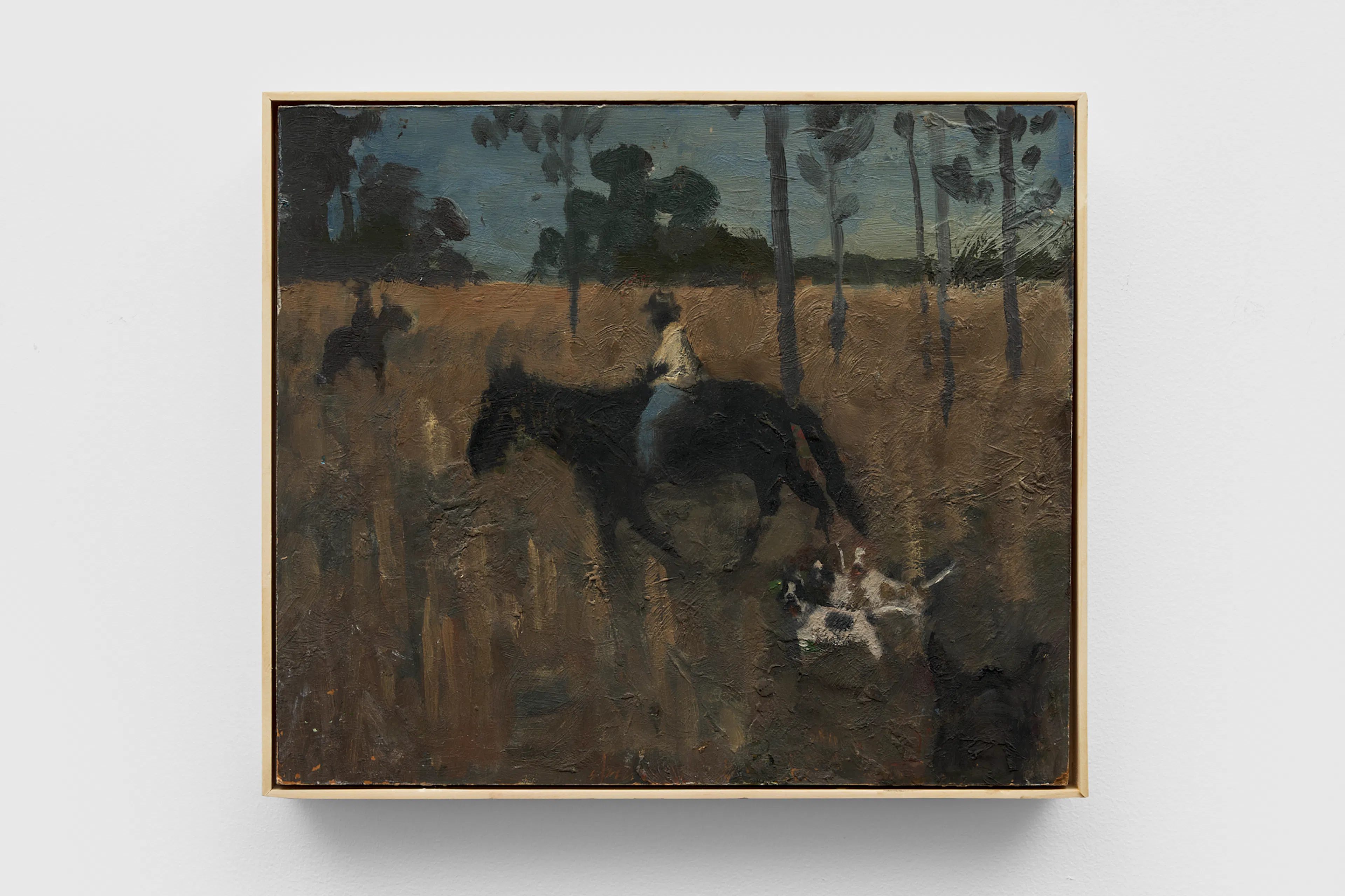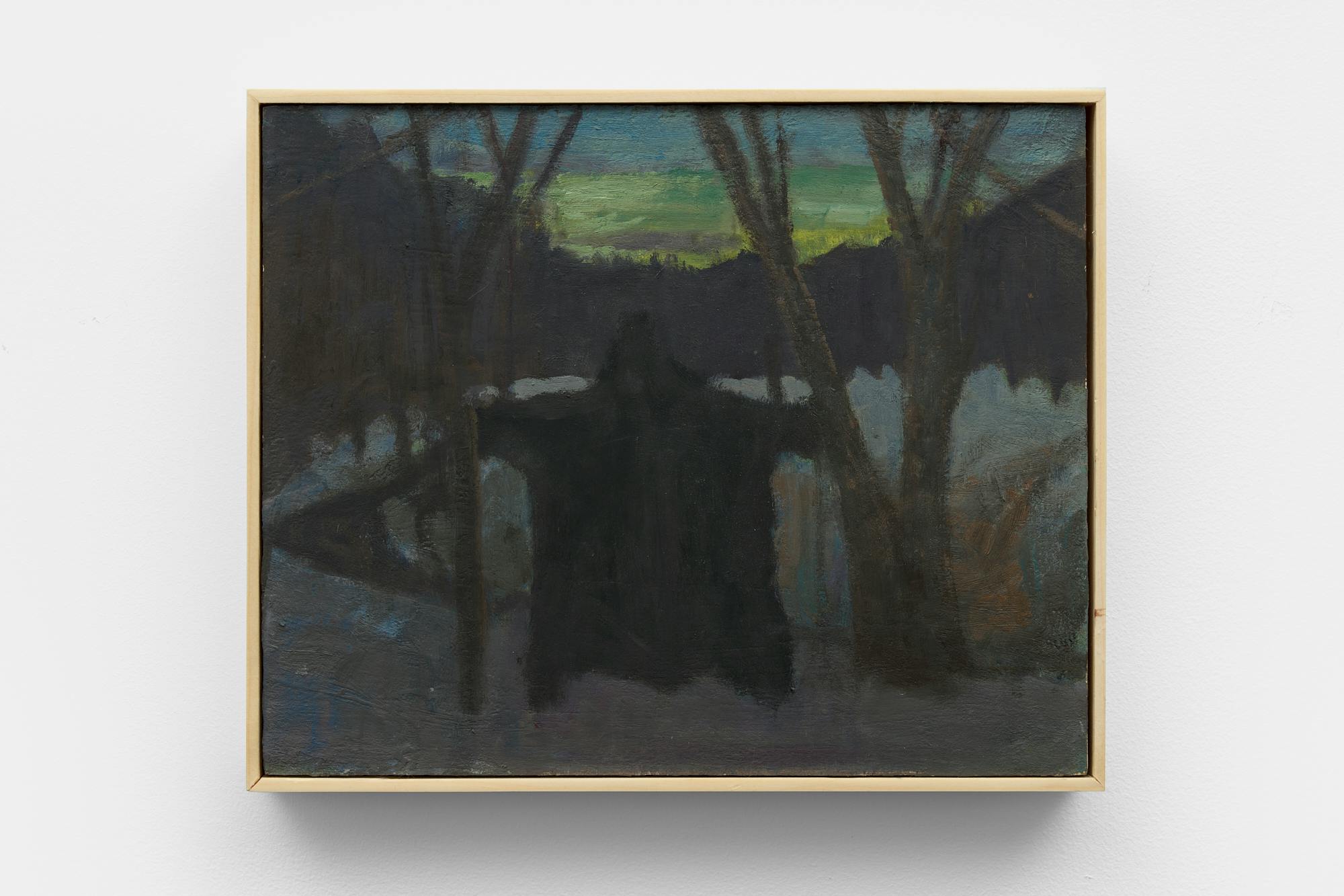 Objects appear worn, seasonal light shifts across interiors and fields, and the boundary between presence and absence remains gently unstable. In Night Meadow with a Bear, a dark bear skin hangs between bare tree trunks at the center of a wooded winter landscape. The form drifts in and out of focus; while its silhouette recalls an animal, it can also register as the shadow of a humanlike figure.