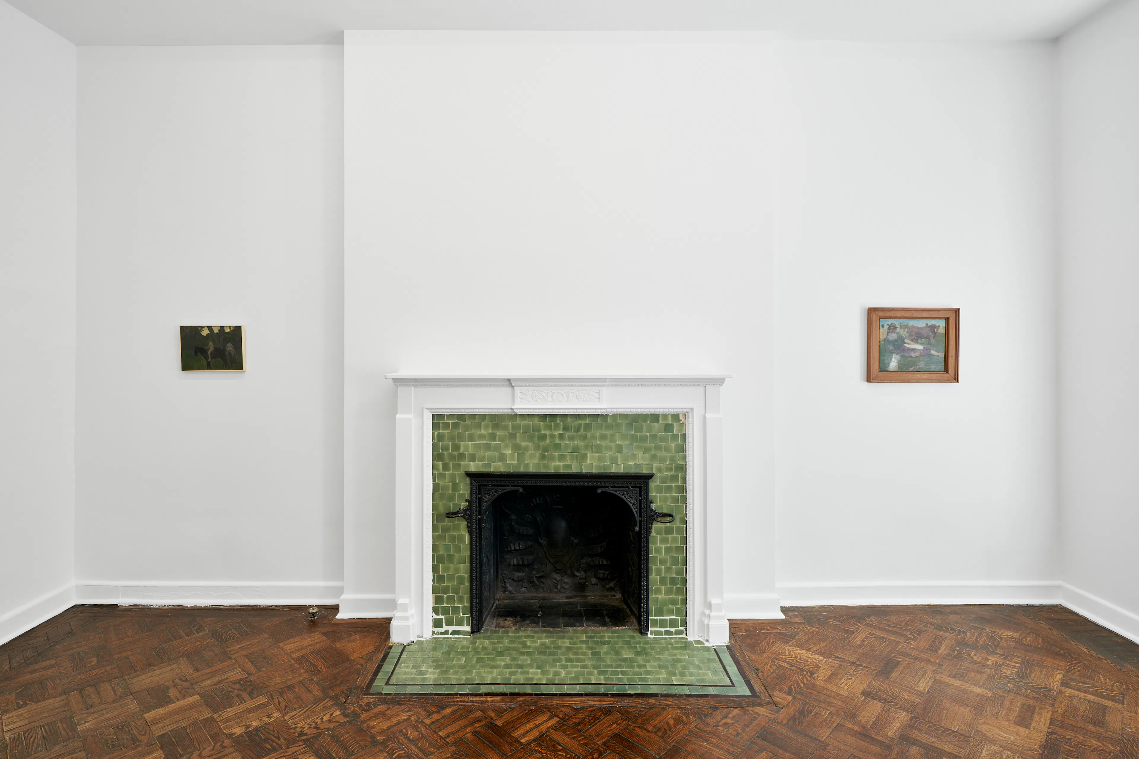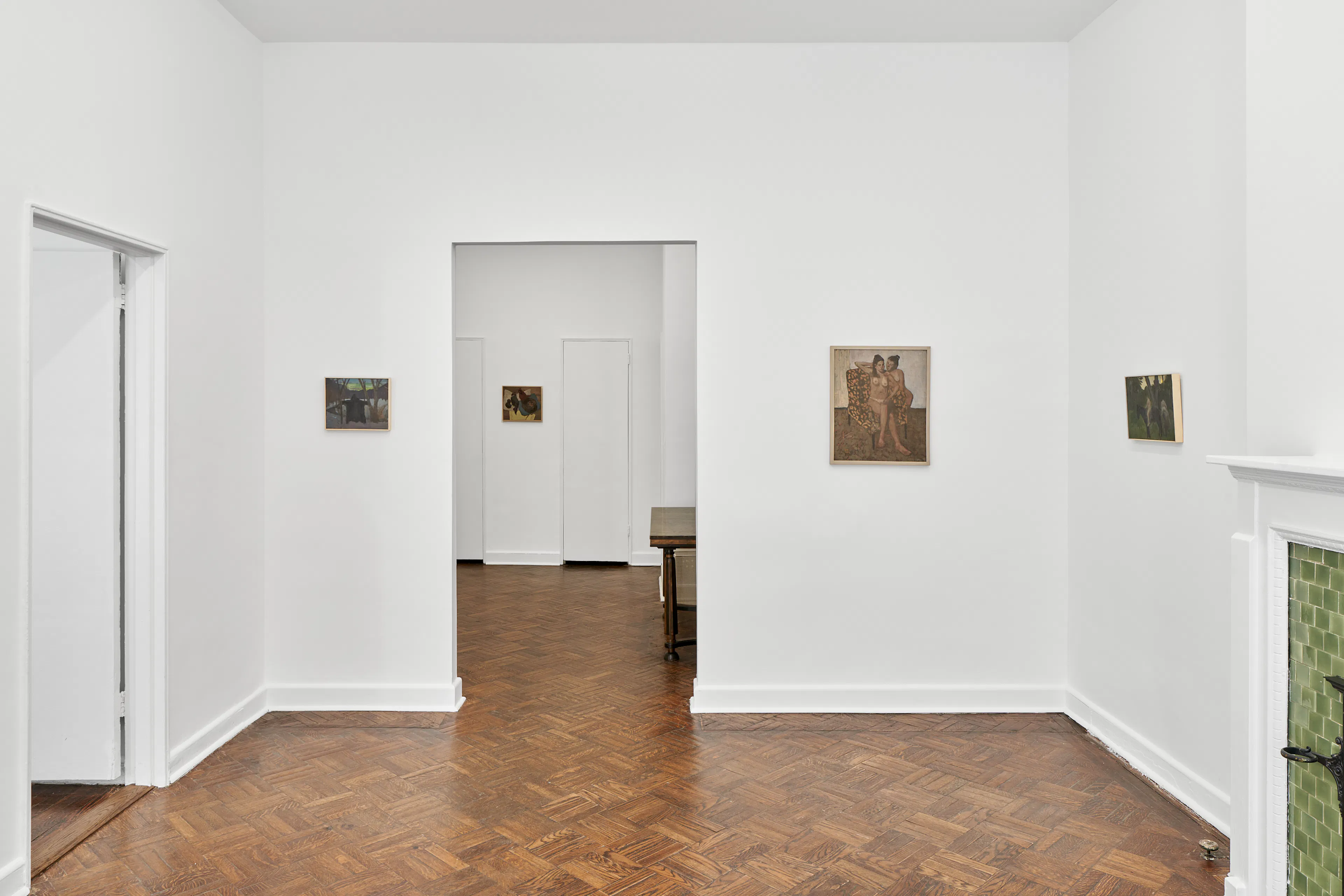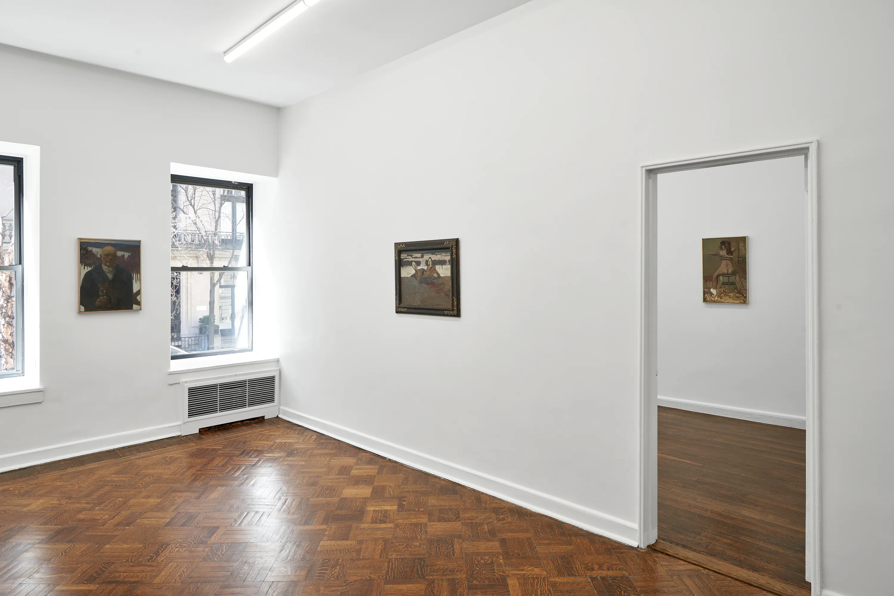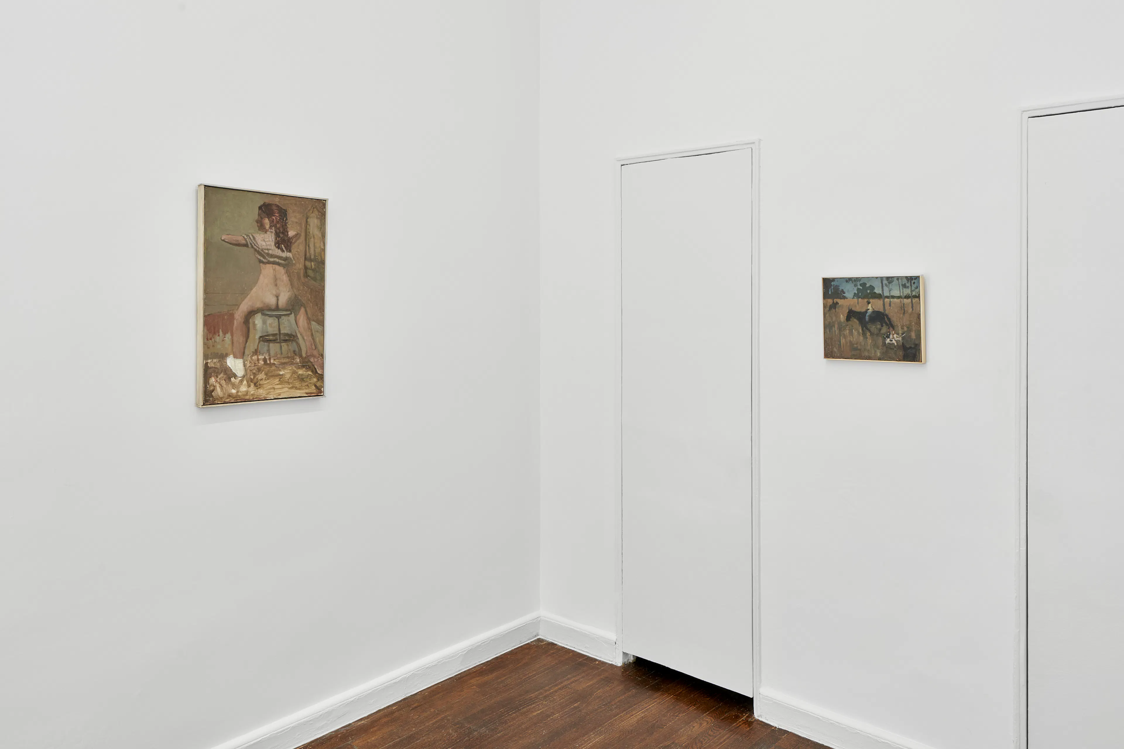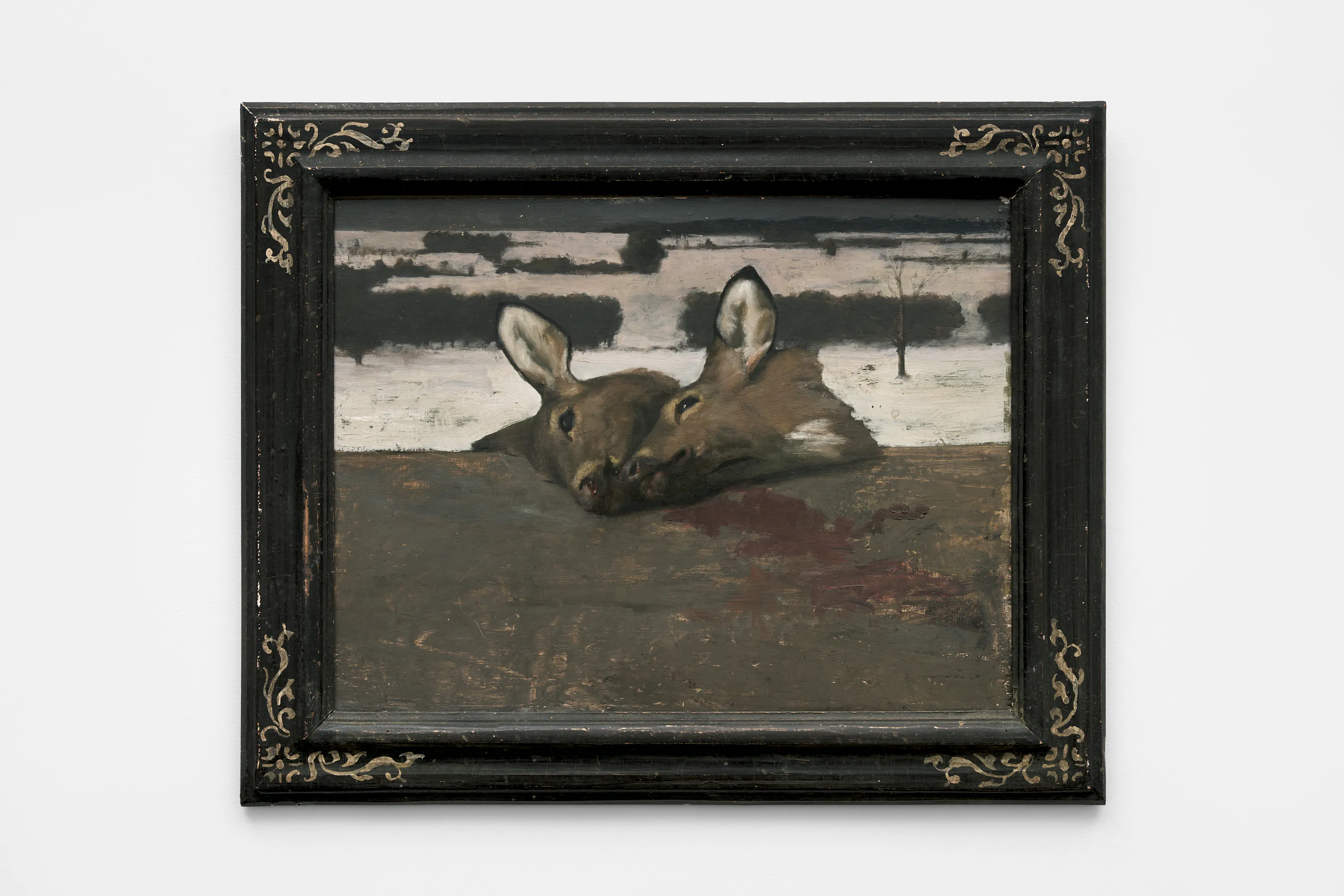 Objects appear worn, seasonal light shifts across interiors and fields, and the boundary between presence and absence remains gently unstable. In Night Meadow with a Bear, a dark bear skin hangs between bare tree trunks at the center of a wooded winter landscape. The form drifts in and out of focus; while its silhouette recalls an animal, it can also register as the shadow of a humanlike figure.