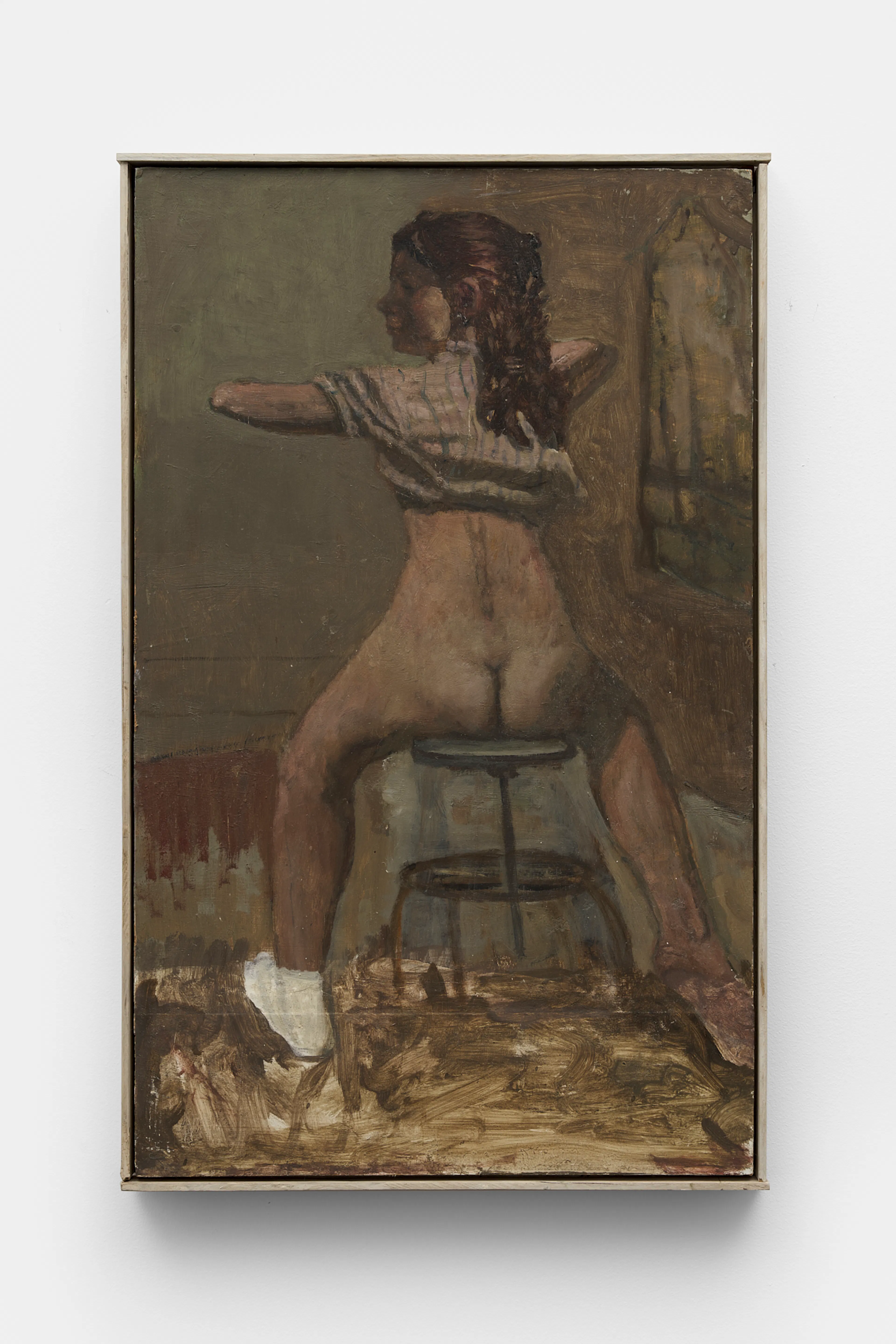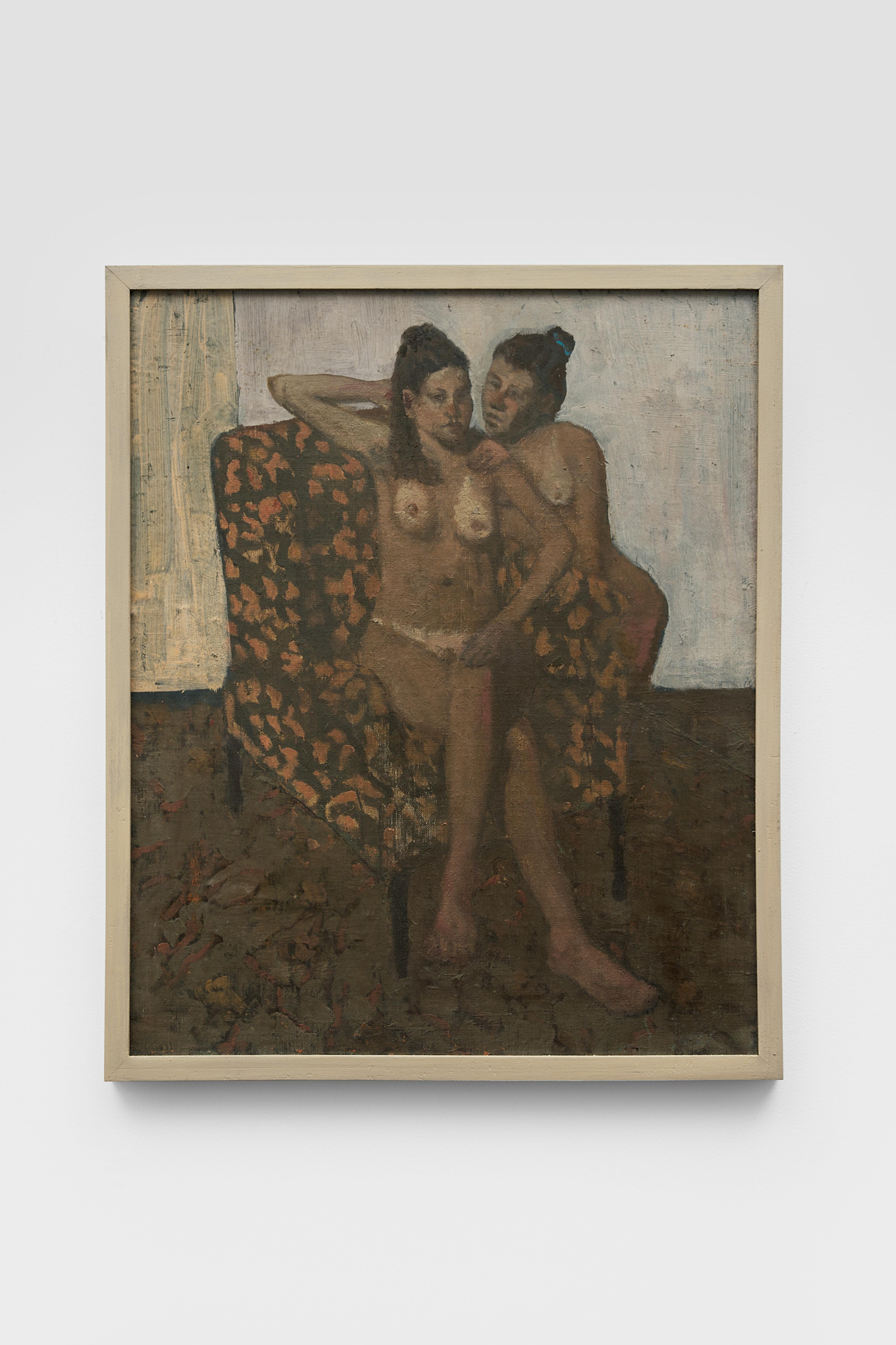 In Two Women, two nude figures and a patterned upholstered chair are set against a pale interior wall. The sitting figure in front faces forward with one arm lifted behind her head, while the second woman leans in from behind, her body turned slightly toward the first in an intimate, overlapping pose. Their forms are softly defined with muted browns and warm flesh tones, and the paint handling feels loose and atmospheric. The background remains sparse, placing emphasis on the figures’ quiet interaction and the patterned chair that frames their bodies. The interior withholds temporal cues, allowing the scene to exist within a quiet ambiguity that feels both present and indeterminate.