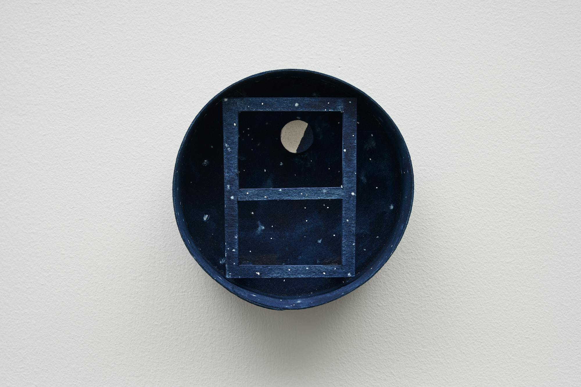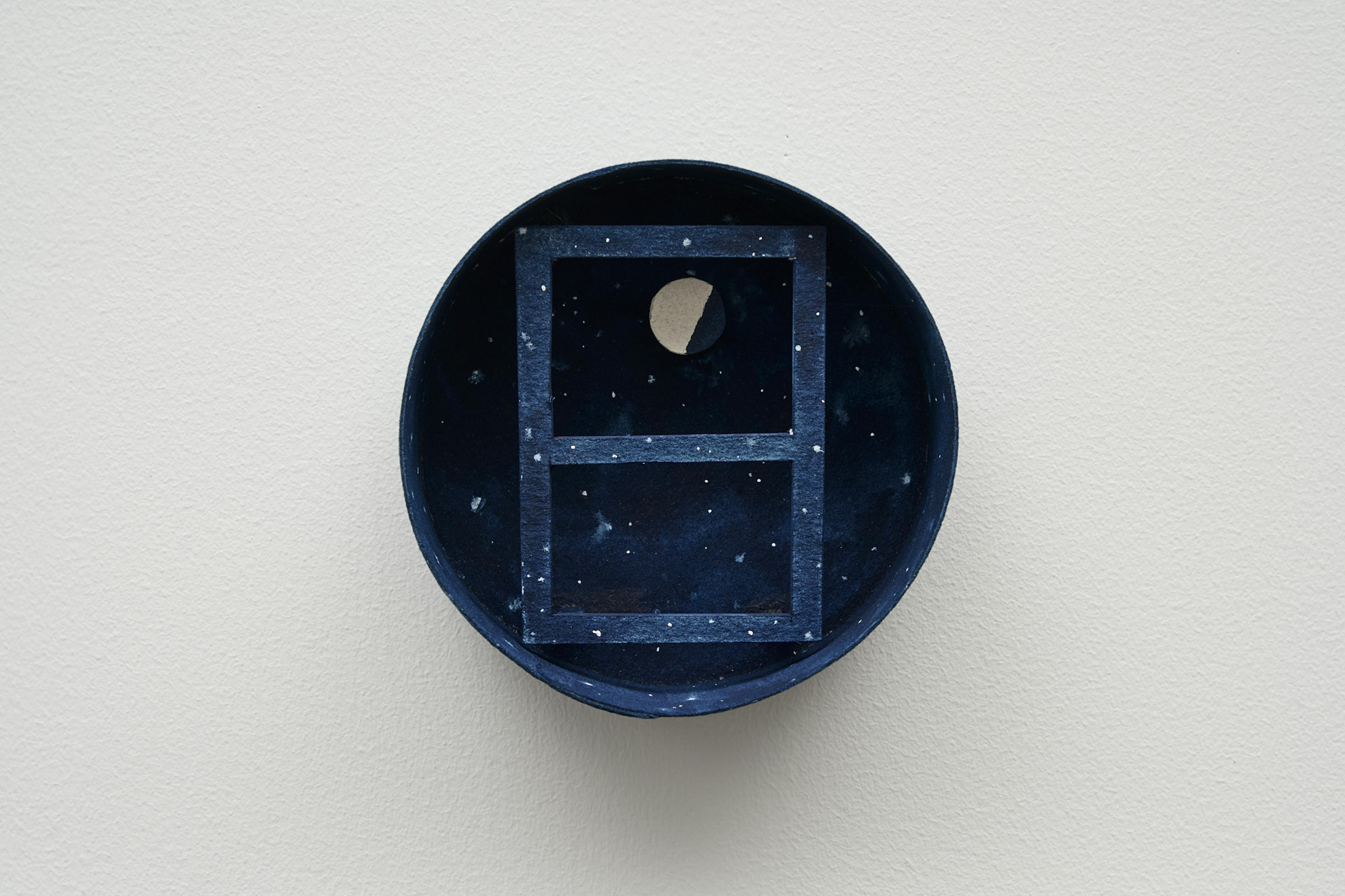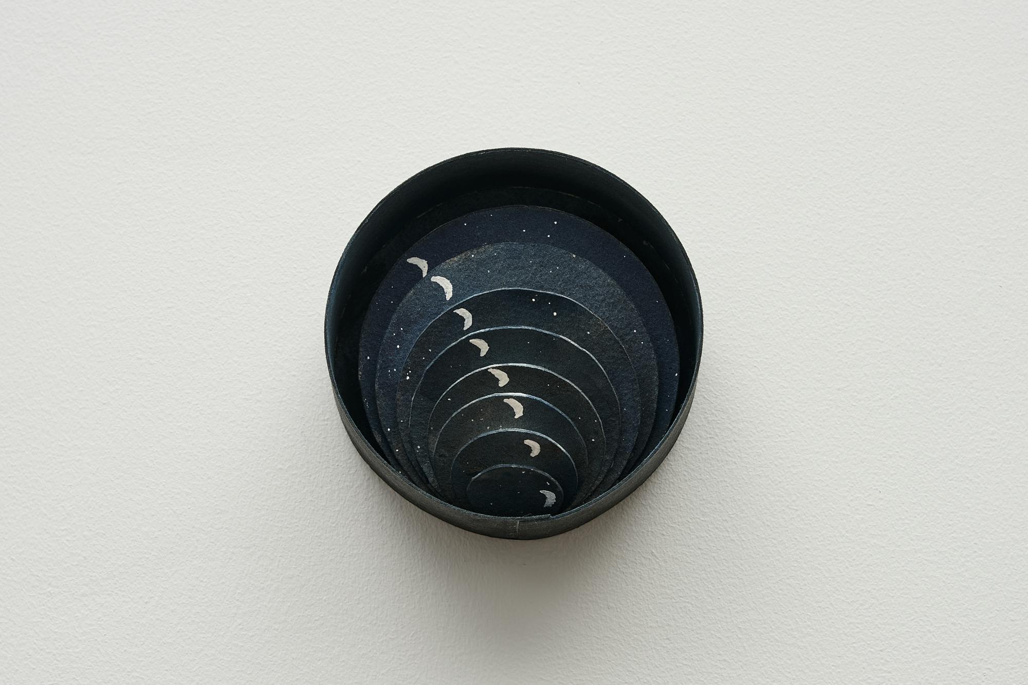 There is an innocent and childlike sense of wonder toward nature in Bohnenkamp’s work. In his paper constructions, he creates three-dimensional views of the moon, seen as if through a bedroom window. The moon appears distant, small, and often fractured, present as something visible but not possessed, held at a remove rather than resolved into meaning. In these works, minimalism and childlike thought draw close to one another, intersecting at the level of essence where reduction does not assert authority but loosens it. What comes into view is a mode of attention oriented toward potential.